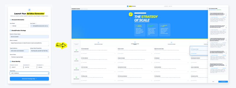 Turn your strategy into dozens of high-converting hooks and detailed image prompts in seconds. Simply copy-paste them into your favorite AI tool like ChatGPT, Gemini, or Midjourney, to generate weeks of creative instantly.