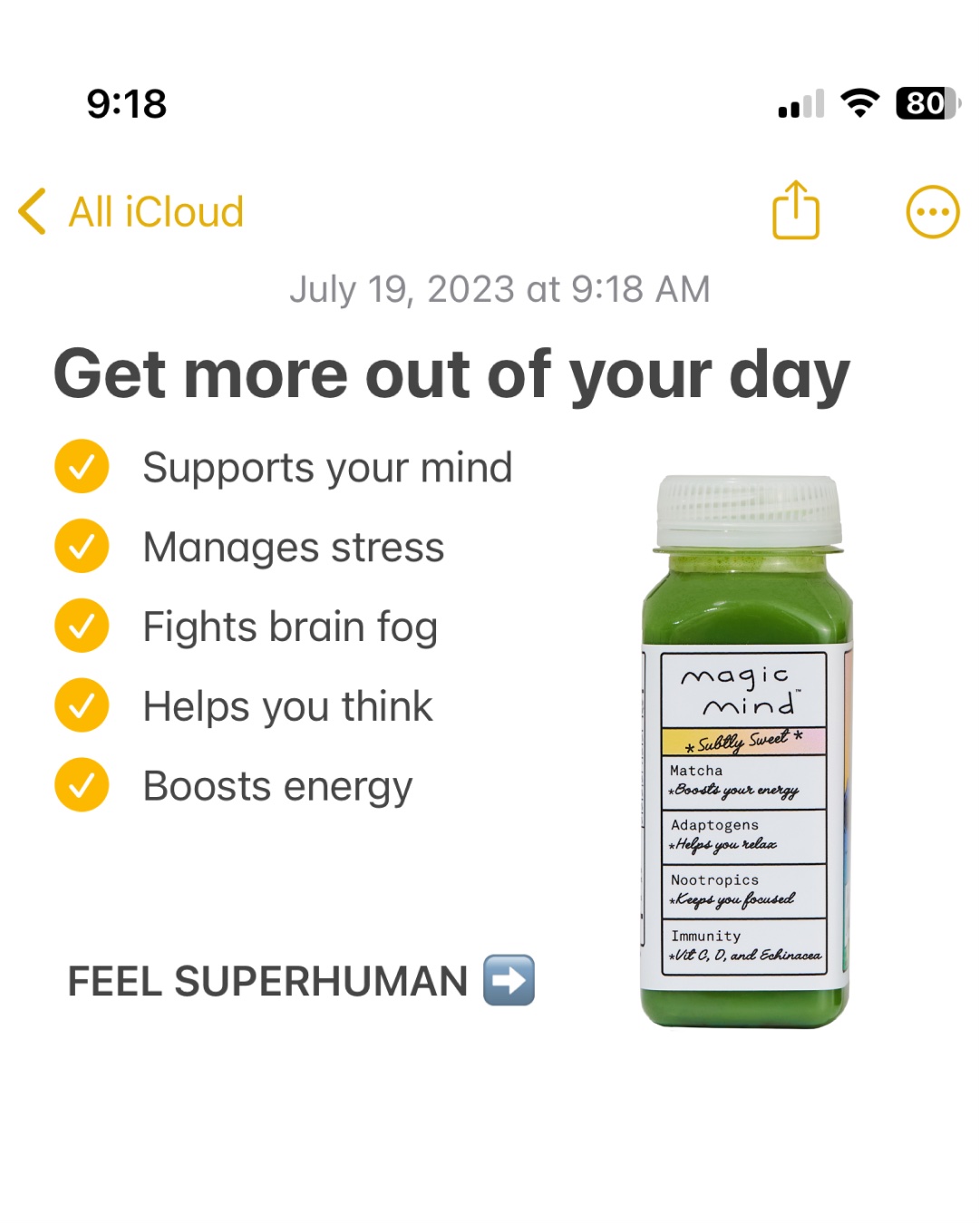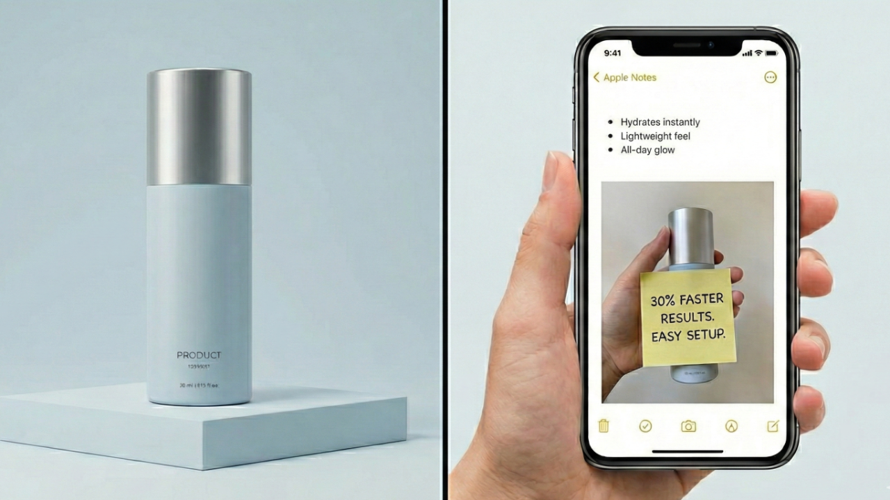 Write a benefit on a sticky note by hand. Stick it to your product. Take photo. Run ad.